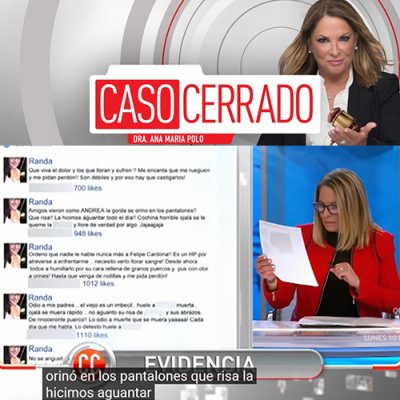 Ves-hiCaso Cerrado és un programa de judicis emès al canal Telemundo. En aquest capítol es veuen les diferències entre pare i mare a causa de la seva filla de 15 anys que ocupa el rol d'agressora i disposa d'un perfil a xarxes socials ocult on mostra discursos d'odi, al marge del seu públic on mostra una cara totalment diferent. Intervenen diversos especialistes i una de les noies assetjades com a testimonis.