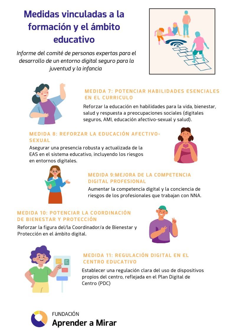 Descripción: Reforzar la presencia de los contenidos de la educación afectivo-sexual en el sistema educativo, teniendo en cuenta, además de contenidos generales sobre esta temática, los riesgos relacionados con los entornos digitales, en particular los riesgos y afectaciones sobre las relaciones afectivo-sexuales por el mal uso de los dispositivos digitales o el consumo de contenido no apropiado para el desarrollo de niñas, niños y adolescentes. Asimismo, se incluirá contenido relacionado con la lucha contra las violencias sexuales en línea desde un enfoque de derechos aportando a NNA herramientas para la prevención y notificación de contenidos inapropiados. Ante las dificultades que plantea la inclusión de una asignatura de EAS en el currículo y la voluntad de reforzar estos contenidos, se formulan las siguientes recomendaciones de más fácil encaje en nuestro sistema educativo actual: