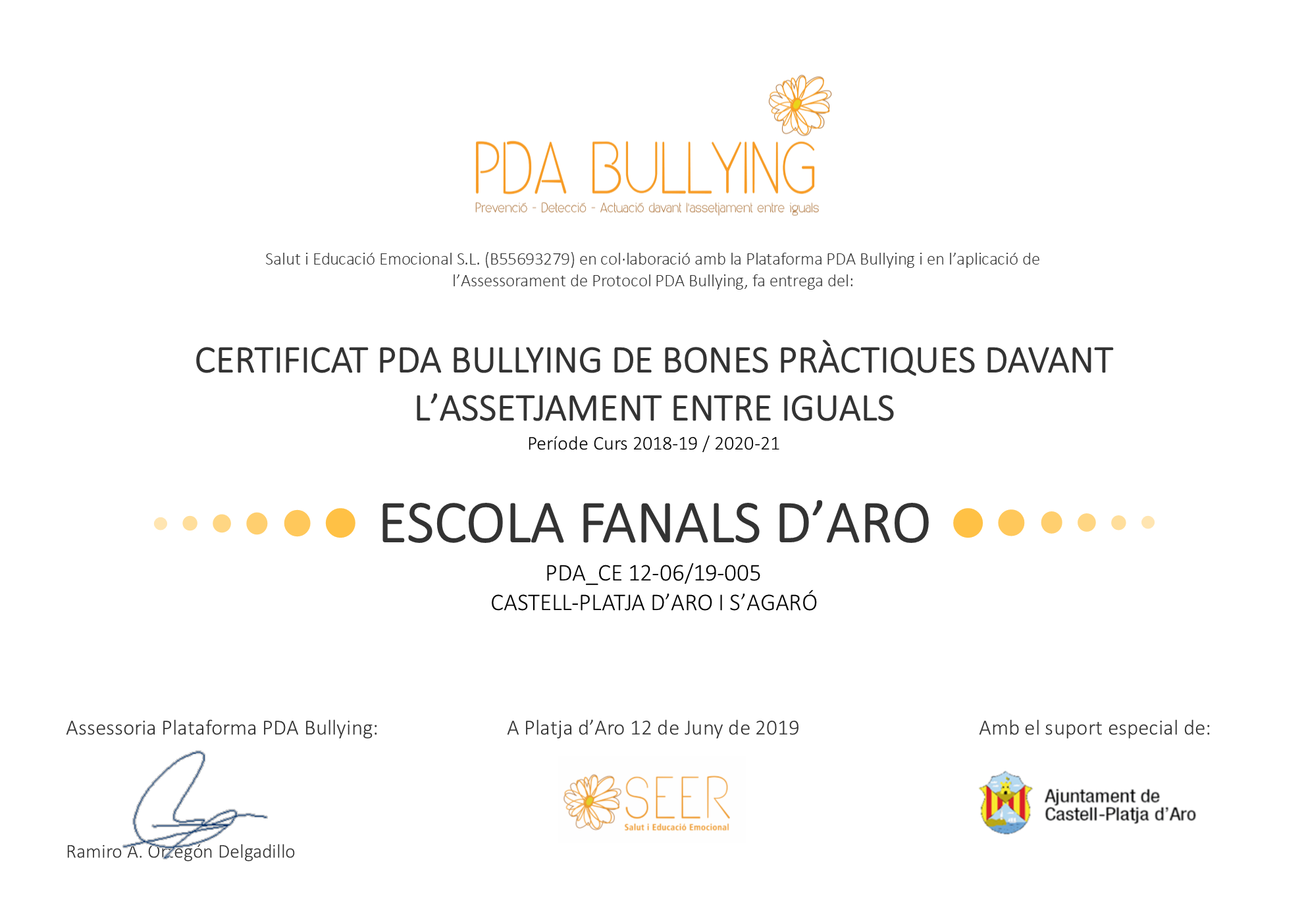 Escola Fanals d'Aro forma part dels centres educatius de Castell-Platja d'Aro i S'Agaró, tots ells participants actius del Programa municipal per a la millora de la convivència. Educació Emocional i resposta integral al Bullying a través de l'acció educativa i la formació.