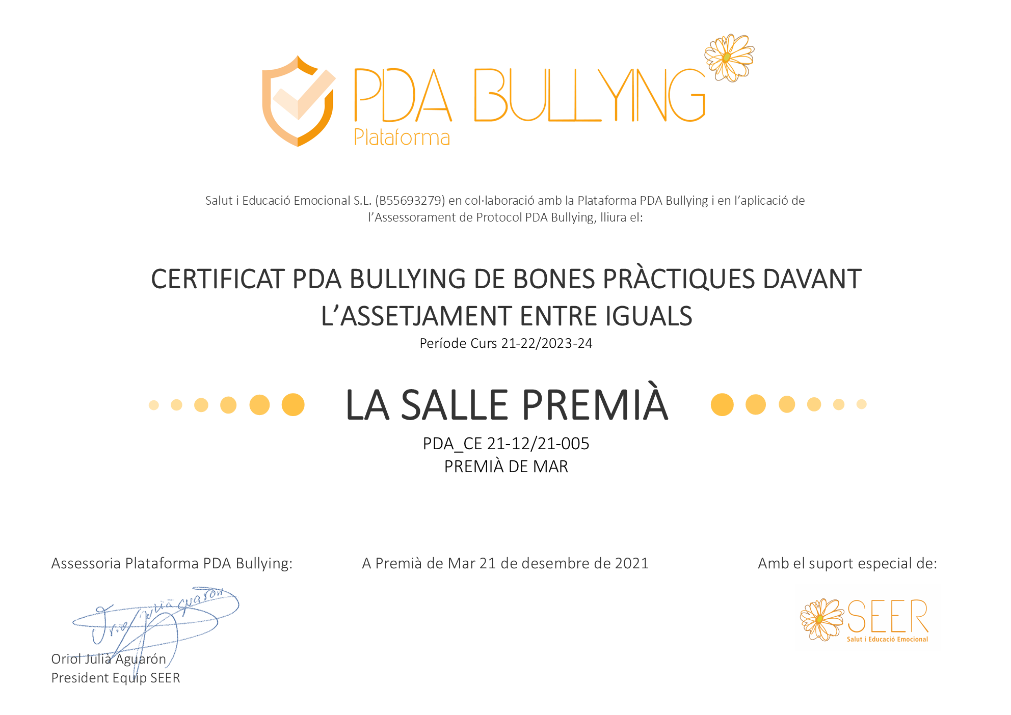 CERTIFICAT PDA BULLYING: PDA_CE 21-12/21-005