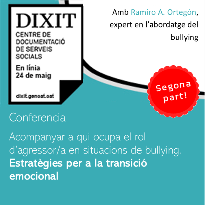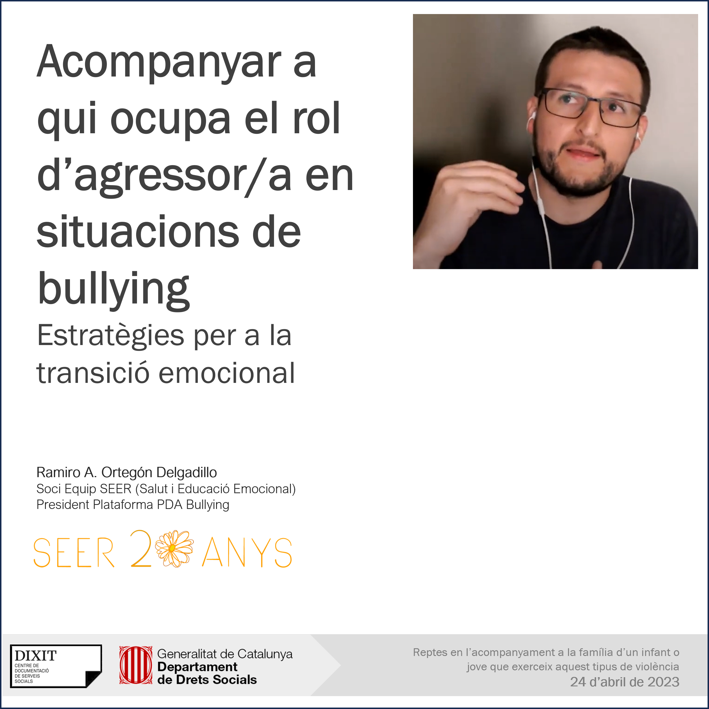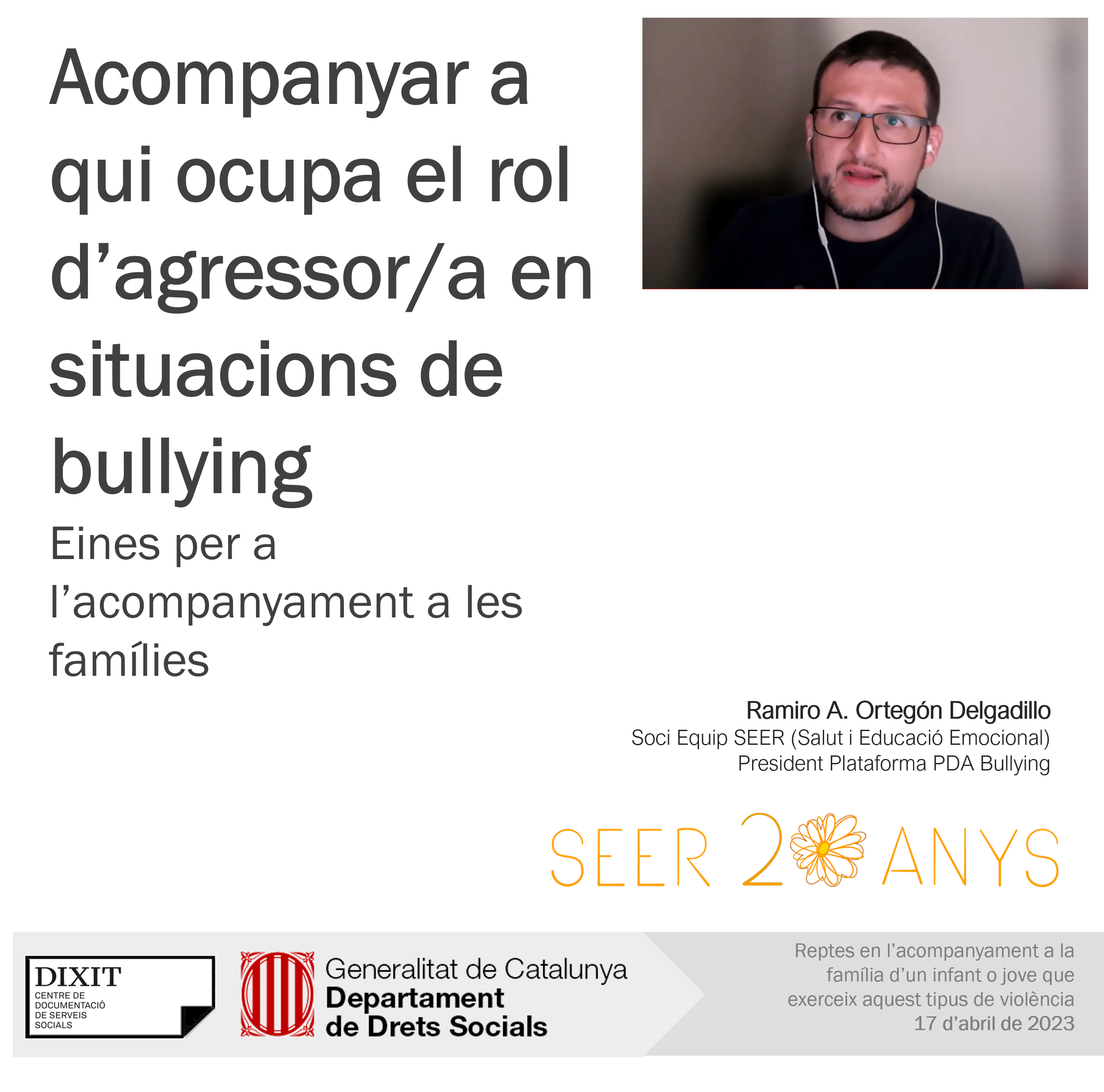 En col·laboració amb el DIXIT (Centre de Documentació de Serveis Socials) es proposen dues conferències virtuals sobre 'Acompanyar a qui ocupa el rol d’agressor/a en situacions de 'bullying', de la mà de Ramiro A. Ortegón, President de la Plataforma PDA Bullying i Soci d'Equip SEER.