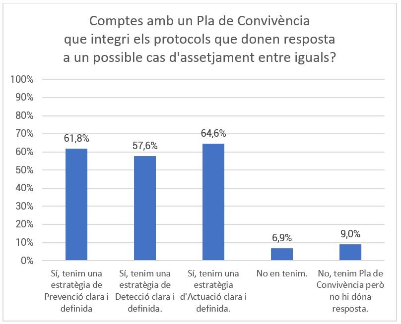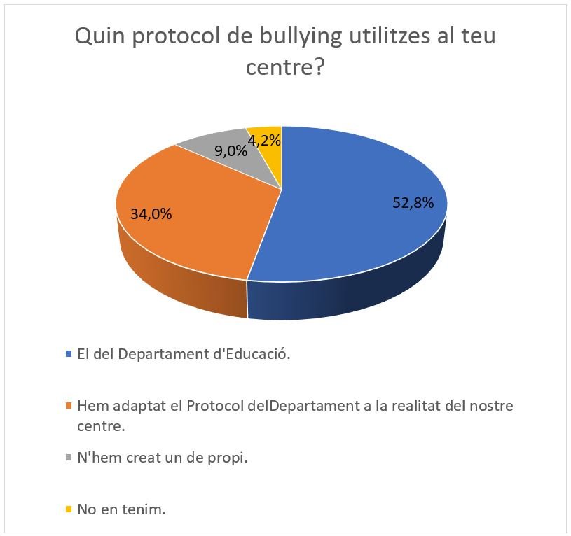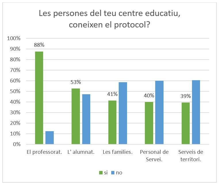 Els resultats semblen indicar que, en la seva majoria, el professorat té coneixement del protocol. No obstant això, els números disminueixen amb la resta de la comunitat educativa, això és: poc més del 50% de l'alumnat és conscient que existeix un protocol de resposta al bullying i menys del 50% dels centres educatius participants comparteixen el protocol amb les famílies, personal de servei i altres equipaments o serveis territorials.