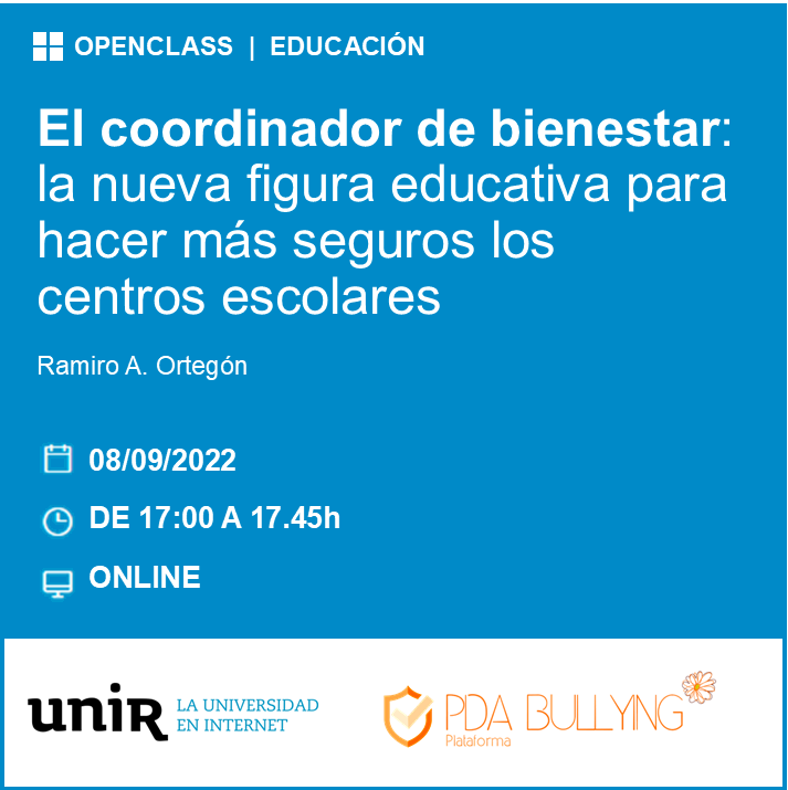 El dijous 8 de setembre a les 17h (Hora península), a càrrec de Ramiro Ortegón, president de la Plataforma PDA Bullying, es va fer l'Openclass d'UNIR: El coordinador de bienestar: la nueva figura educativa para hacer más seguros los centros escolares.