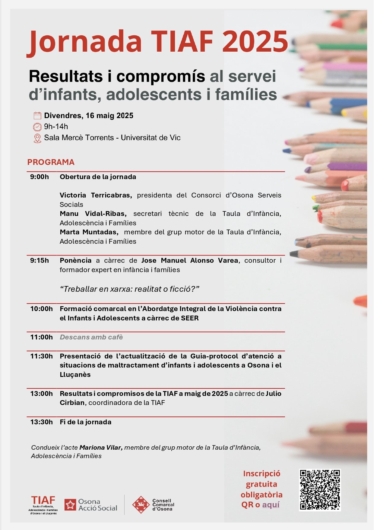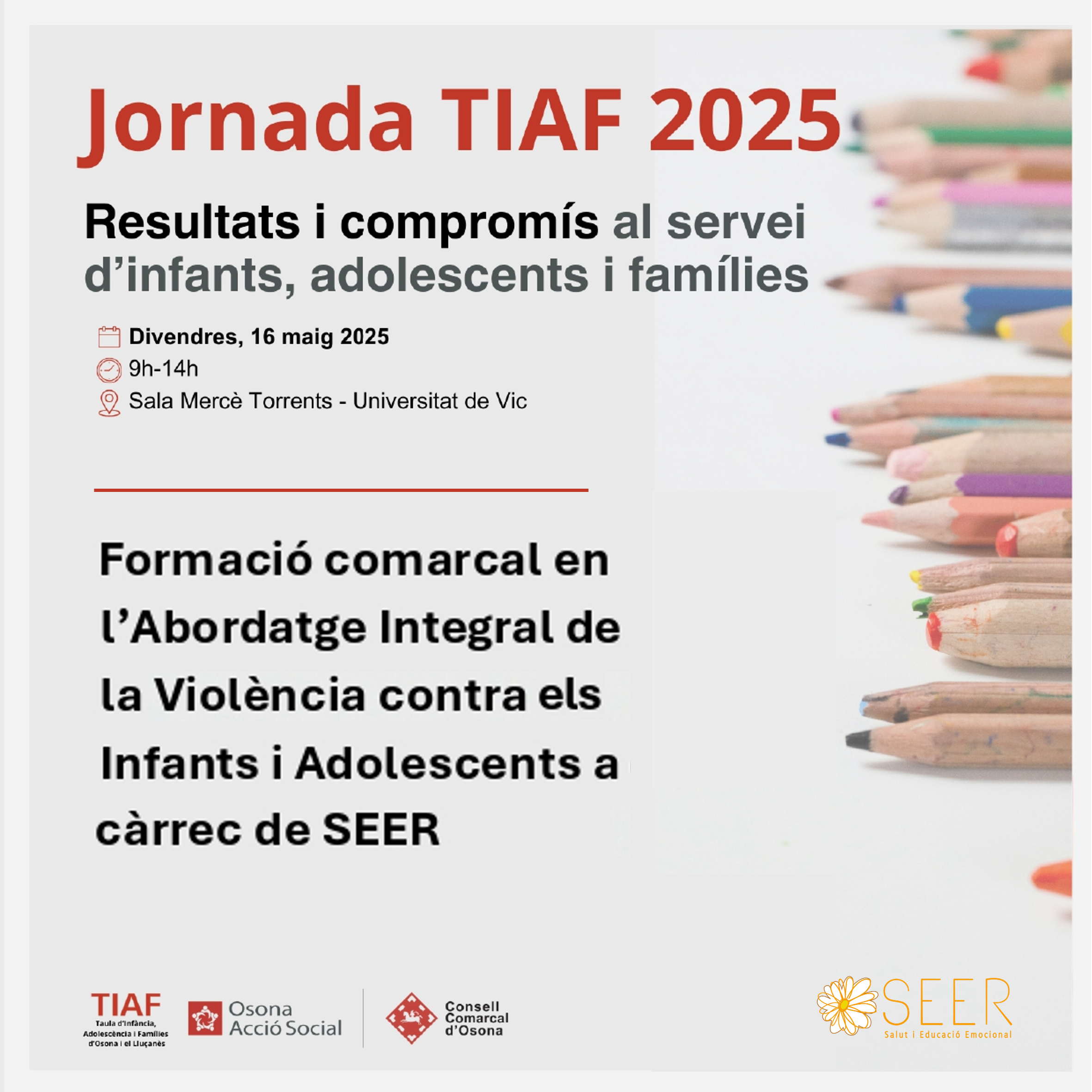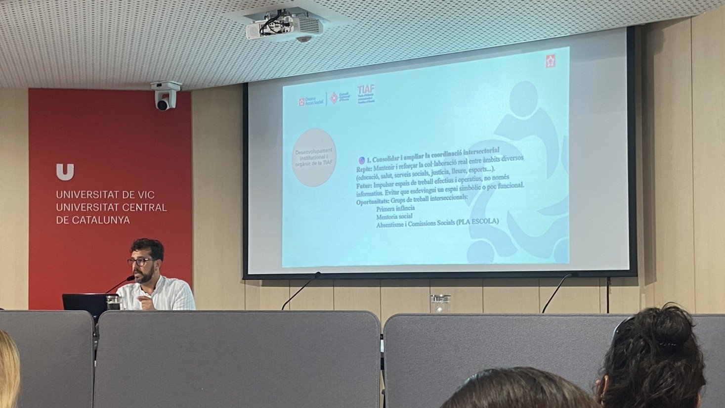 Participem d'una Jornada organitzada des de la Taula d’Infància, Adolescència i Famílies (TIAF) d'Osona i Lluçanès, a la Sala Mercè Torrents de la Universitat de Vic-Universitat Central de Catalunya (UVic-UCC) per reforçar el treball en xarxa entre serveis socials, salut, educació i altres agents implicats en la cura d’infants, adolescents i les seves famílies.