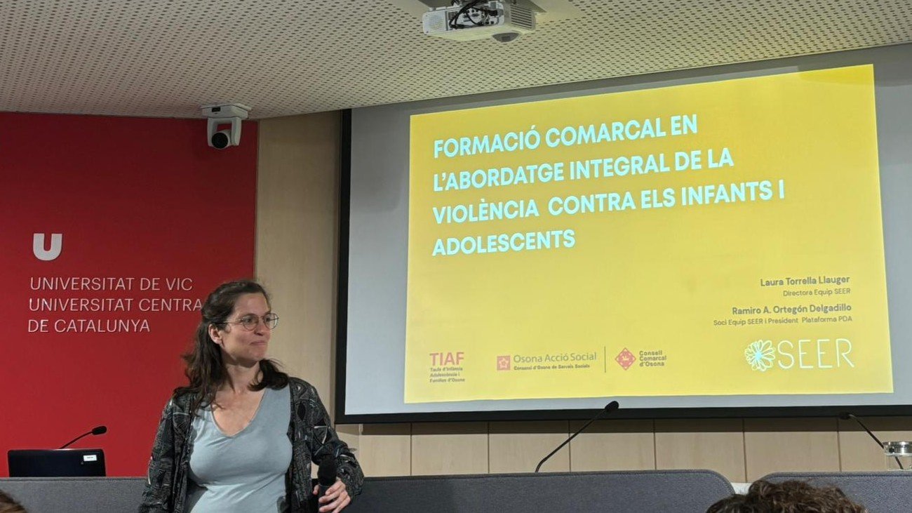 L'espai la facilitat la Laura Torrella (Directora d'Equip SEER) i en Ramiro Ortegón (President de Plataforma PDA), qui han presentat una conferència amb aprenentatges sobre la formació a la TIAF en l’abordatge integral de la violència contra els infants i adolescents.