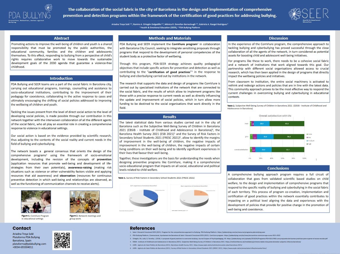 La col·laboració del teixit social de la ciutat de Barcelona en el disseny i la implementació de programes de prevenció i detecció integral en el marc de la certificació de bones pràctiques per abordar l'assetjament entre iguals [veure pòster].