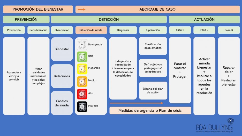 2. Actualització de contingut clau de la guia i posada en comú de recursos clau detectats per a les fases de prevenció, detecció i actuació en l'abordatge d'autolesions i ideacions suïcides. El contingut de la guia està estructurat fent servir com a marc el protocol i fases PDA, cosa que ens permet donar una resposta integral al fenomen del suïcidi, els intents i les autolesions. Per poder donar forma a aquest contingut hem revisat prèviament 52 guies i recursos diferents, un treball que ens ha ajudat a detectar a quines fases encara cal donar resposta. En general, ens hem trobat que la fase dactuació té un ampli potencial de millora, especialment des de la mirada de grup. Al peu d'aquesta notícia podràs trobar l'enllaç a alguns dels recursos més interessants que hem trobat i penjats al nostre banc de recursos. A continuació compartim amb tu el mapa de continguts que estructurarà la nostra guia segons les fases del protocol PDA: