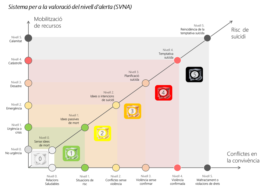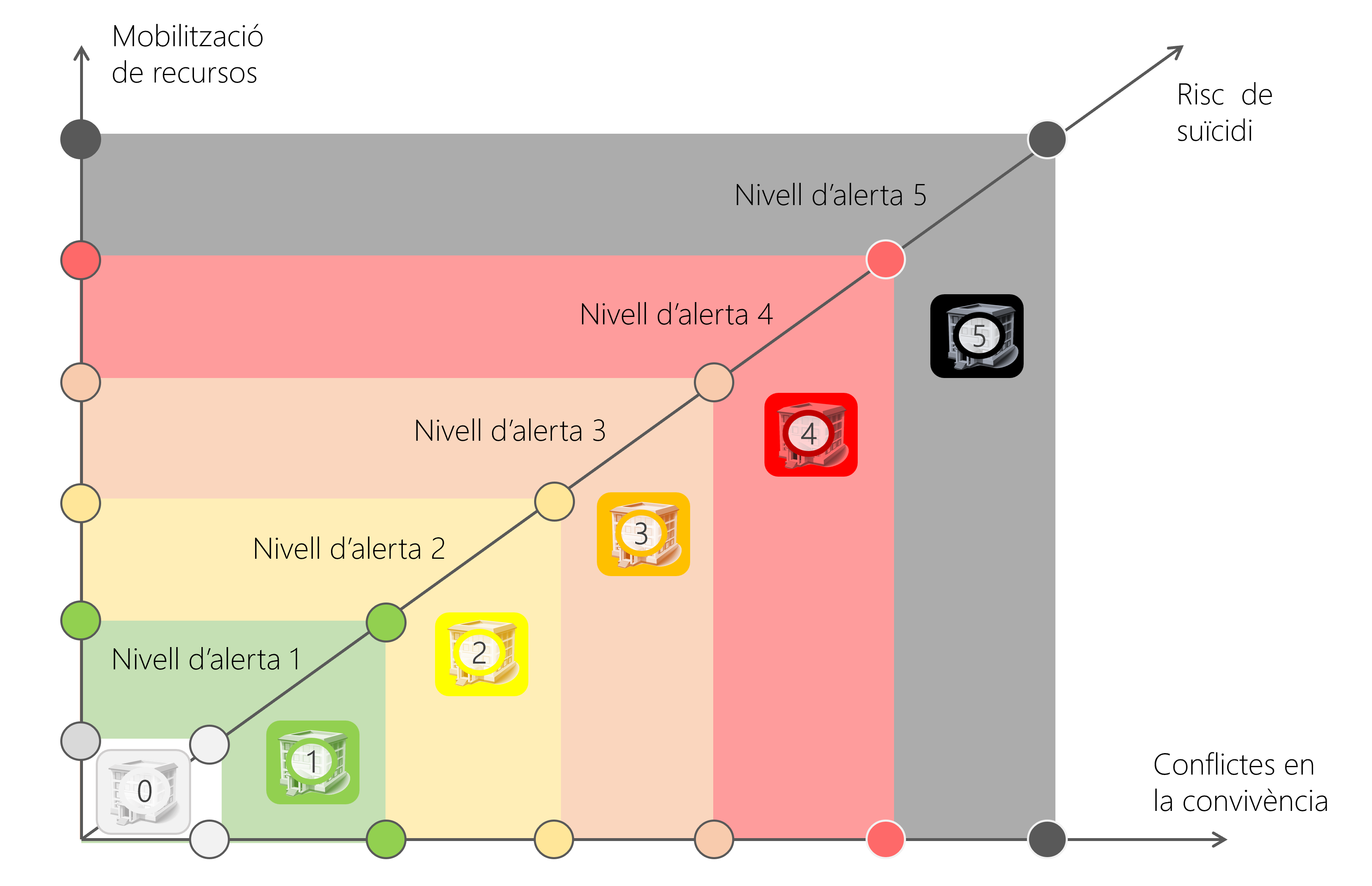 El model està associat al sistema de nivells d'alerta presentat a la guia d'eines i recursos: Obrir camins cap a una vida per viure: guia d'eines i recursos per a l'abordatge de les autolesions i el suïcidi des de l'àmbit socioeducatiu.