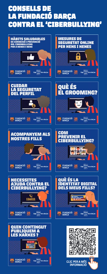 La Fundació Barça proposa una sèrie de consells per tal que els nens aprenguin a fer un bon ús d’internet i puguin prevenir el ciberbullying. Es tracta de nou pautes dirigides a pares i mares. En elles s'esmenten els hàbits saludables necessaris per conviure amb les pantalles, es donen idees per posar en pràctica i s’expliquen conceptes del camp del ciberassetjament, per tal que puguin vetllar per la seguretat dels seus fills a la xarxa.
