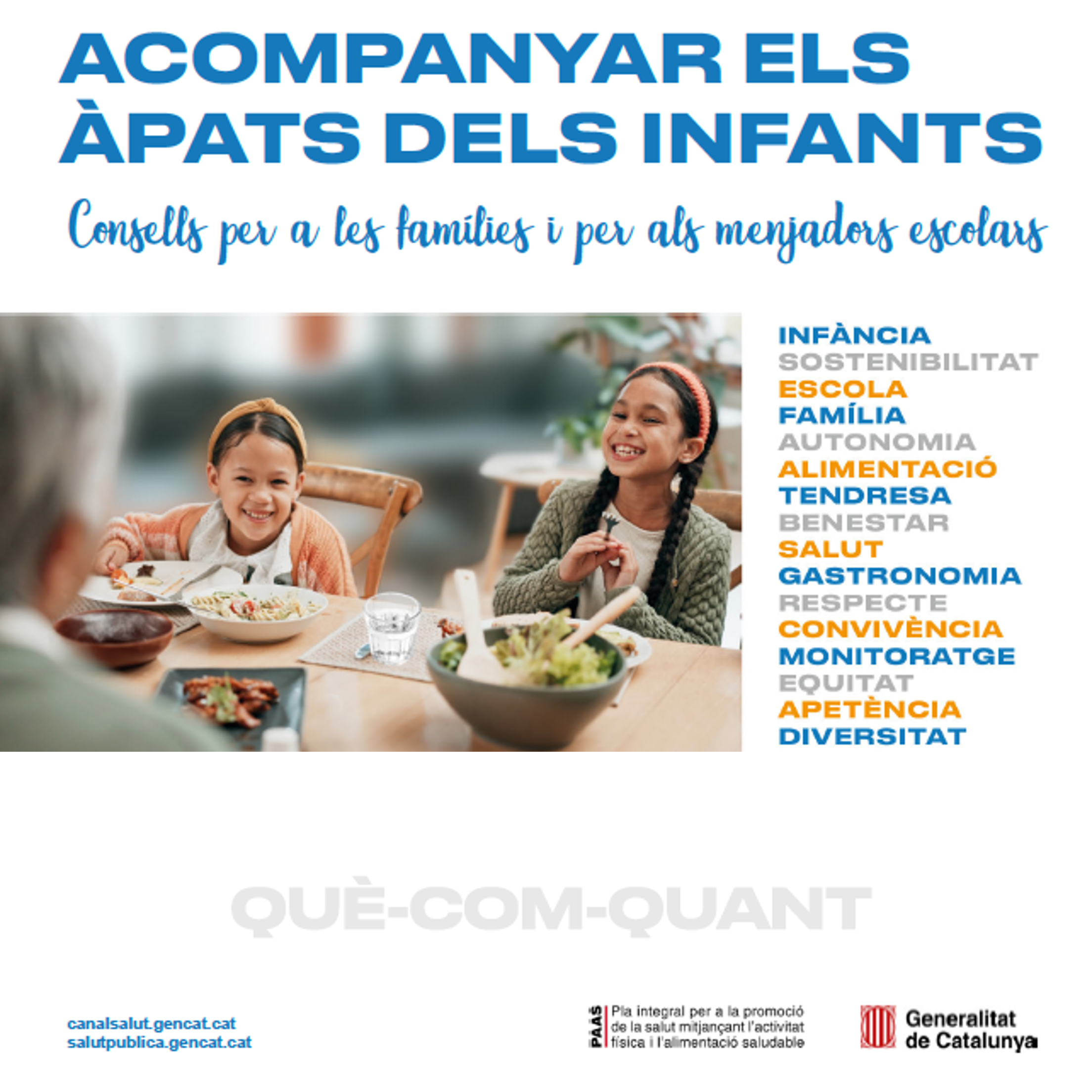 La guia "Acompanyar els àpats dels infants. Consells per a les famílies i per als menjadors escolars" és una proposta de l'Agència de Salut Pública de Catalunya (ASPCAT), que ofereix eines essencials tant per a l'entorn familiar com per a l'escolar. També podeu veure el webinar "El rol dels monitors i monitores en l’acompanyament dels infants durant els àpats a l’escola", organitzada conjuntament amb l'Associació Catalana d'Empreses del Lleure, l'Educació i la Cultura (Acellec) (entitat de suport).
