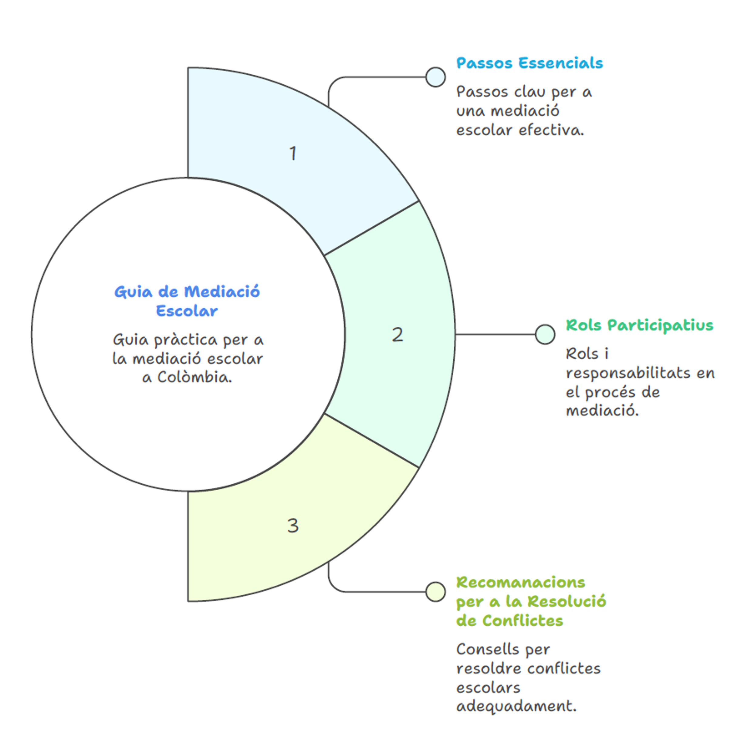 La guia adreçada a la ciutadania (estudiants, famílies, comunitat educativa en general) presenta els conceptes bàsics de mediació escolar de manera accessible: què és la mediació, per què és útil, com participa la comunitat, quins són els beneficis, i com les persones poden acostar-se a aquest mecanisme a la institució educativa. Serveix per generar comprensió, legitimitat i apropiació social del programa.
