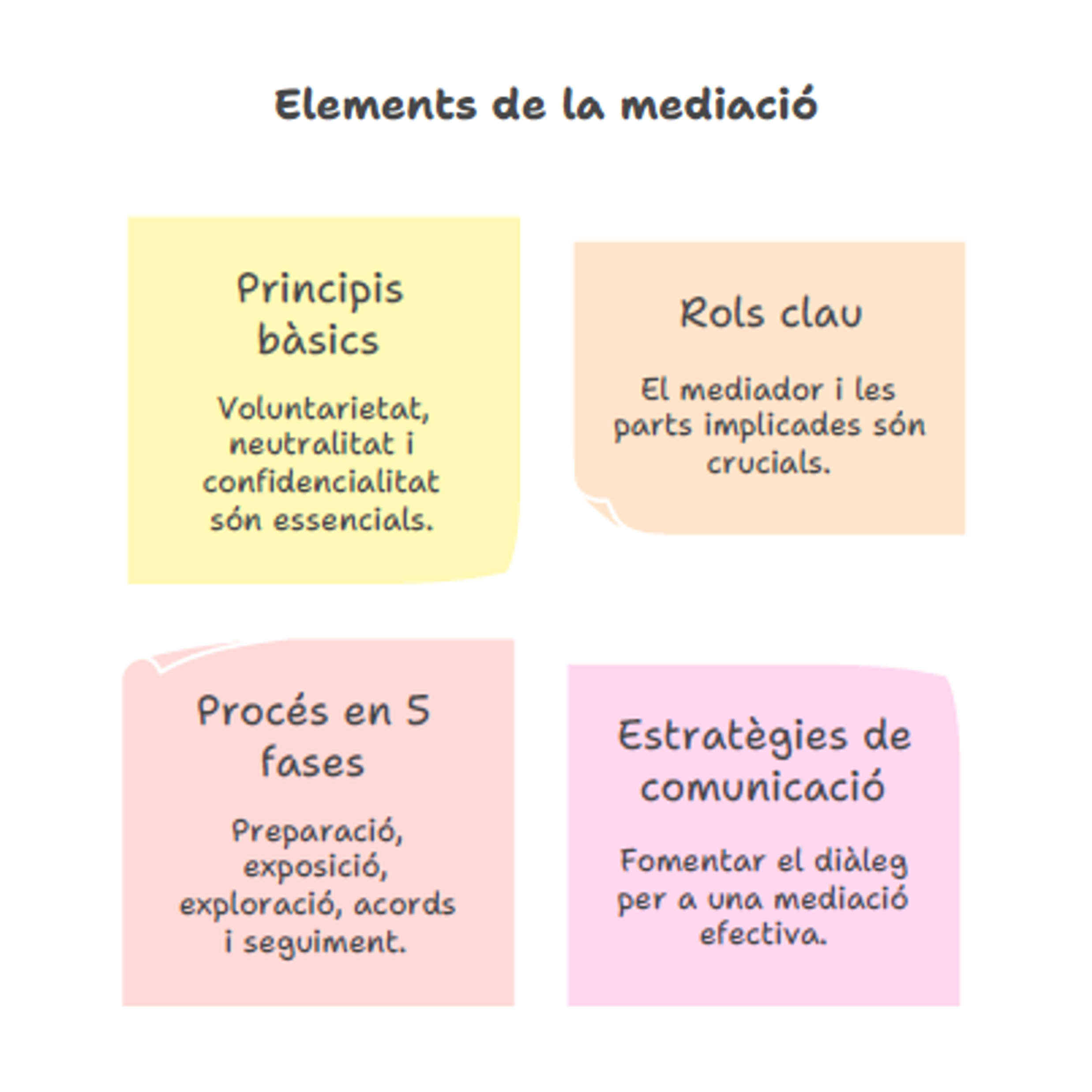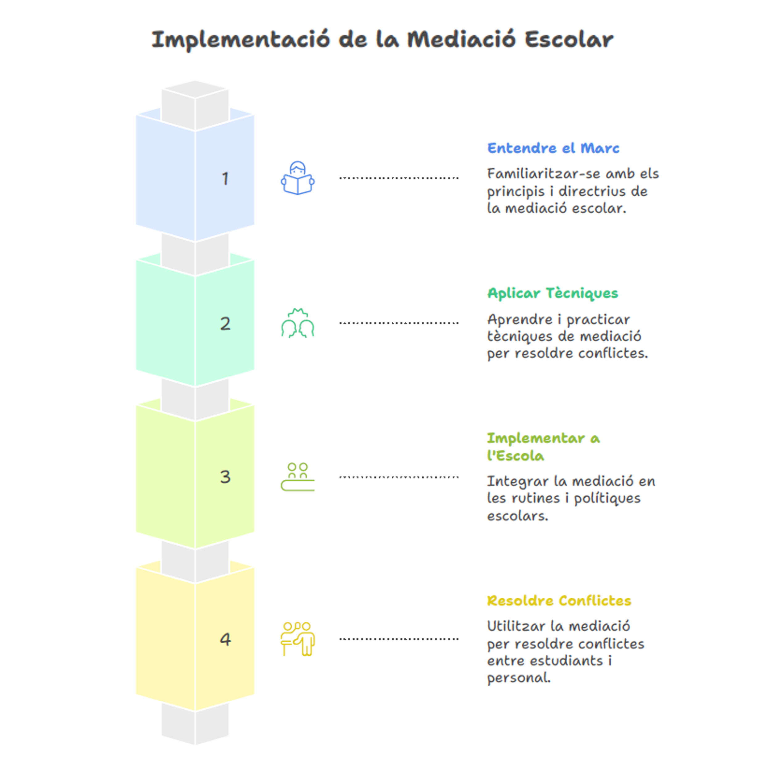 L'objectiu és que la mediació no sigui només un mecanisme reactiu per resoldre disputes, sinó una pràctica preventiva que integri principis de justícia restaurativa, convivència i resolució pacífica del conflicte el dia a dia del col·legi.