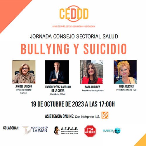 A la Jornada "Bullying y suicidio", organitzada el 19 d'octubre de 2023 pel Consejo Español de Defensa de la Discapacidad y Dependencia (CEDDD), han participat com a ponents, Junibel Lancho, directora de l'Hospital de dia Lajman; Enrique Pérez-Carrillo de la Cueva, president d'AEPAE; Sara Antúnez, presidenta de StopHaters, i Rosa Iglesias, presidenta de la Fundació Planeta TOC. Va moderar la jornada José Manuel Dolader, director de l'Asociación La Barandilla. Es pot veure en vídeo la Jornada completa, així com les anteriors, que es van realitzar al Senat i FEUSO (Federación de Enseñanza).