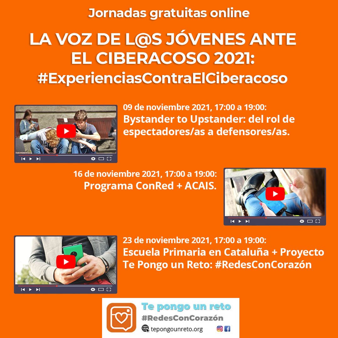 La Fundación Gestión y Participación Social torna a realitzar aquestes jornades online per a tractar el tema del ciberbullying. Emmarcat en el seu projecte Te pongo un reto (entitat adherida a PDA Bullying) i sota el hashtag #RedesConCorazón, el 9, 16 i 23 de novembre de 2021, de 17h a 19h, famílies i educadors poden participar en La voz de l@s jóvenes ante el ciberacoso.