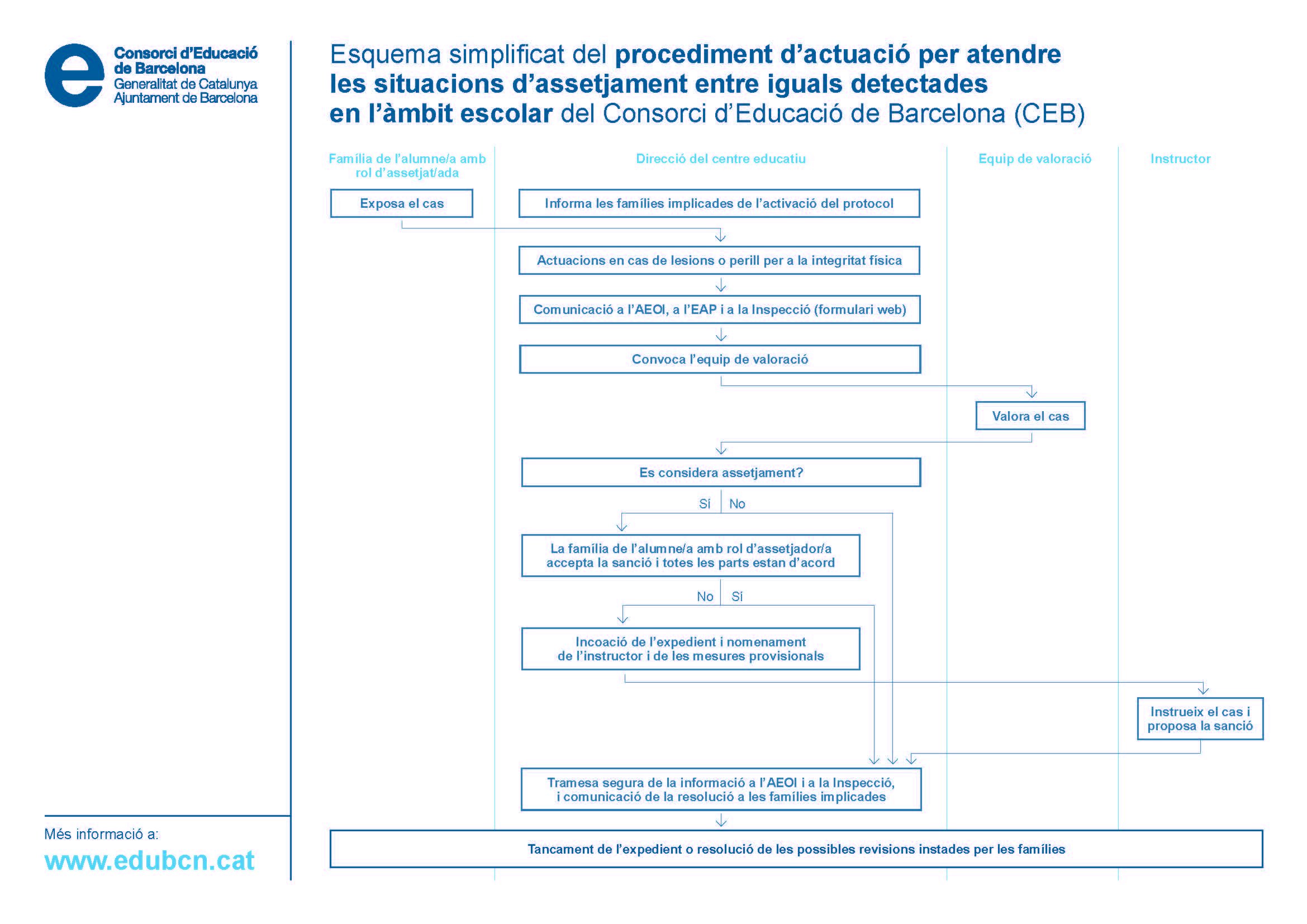 El Consorci d’Educació de Barcelona, tenint present el protocol establert pel Departament d’Educació, ha contextualitzat aquest protocol a la ciutat de Barcelona. Així, l’objecte d’aquest protocol és definir les responsabilitats i procediment d’actuació per atendre les situacions d’assetjament escolar entre iguals, que es produeixin entre alumnes de centres públics o entre alumnes de centres privats a la ciutat de Barcelona.