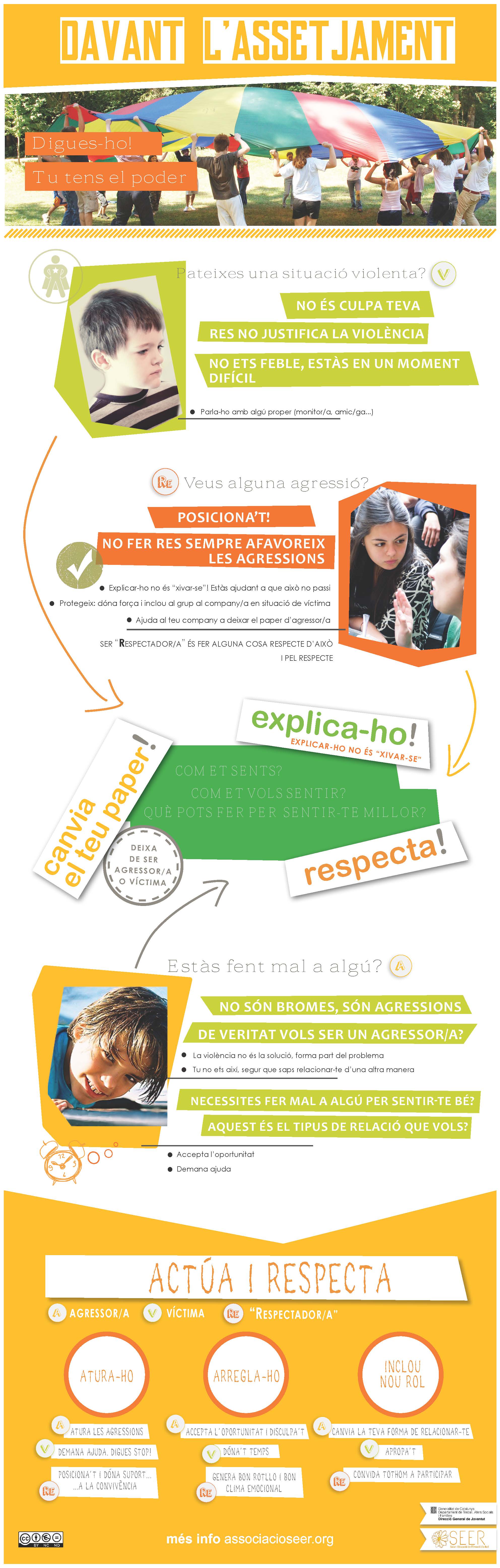 Els continguts han estat creats per SEER com a encàrrec del Departament de Joventut de la Generalitat de Catalunya. En concret, aquesta infografia dona pautes als infants i els joves per tal d'orientar les actuacions davant del bullying en entorns de lleure. També podeu consultar:
