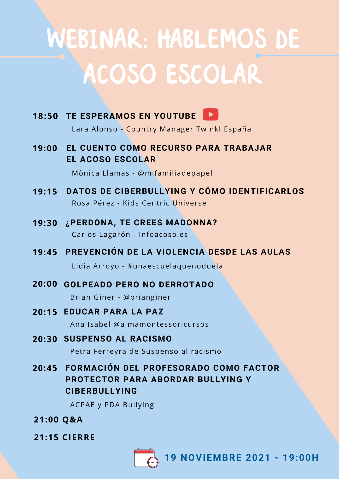 El 19 de novembre de 2021 Twinkl (entitat adherida) organitza el Webinar gratuït "Hablemos de Acoso Escolar". PDA Bullying hi participa conjuntament amb ACPAE (Associació Colombiana per a la Prevenció de l'Assetjament Escolar).