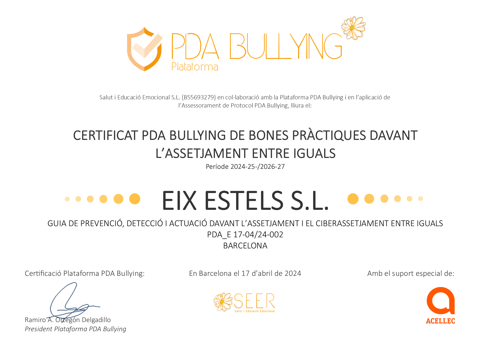 Eix Estels obté el certificat PDA BULLYING pel compromís contra l’assetjament