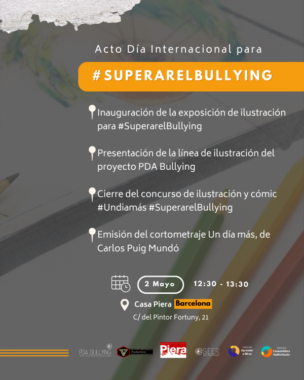 Aprovechamos el 2 de mayo para dar continuidad a la campaña #undiamás por #superarelbullying, proyectando el cortometraje Un Día Más de Carlos Puig Mundó, e inaugurando la línea de trabajo preventivo sobre ilustración empoderada. Además, cerramos el concurso de ilustración y cómic inspirado en la temática del bullying y la diversidad funcional para jóvenes y adultos.