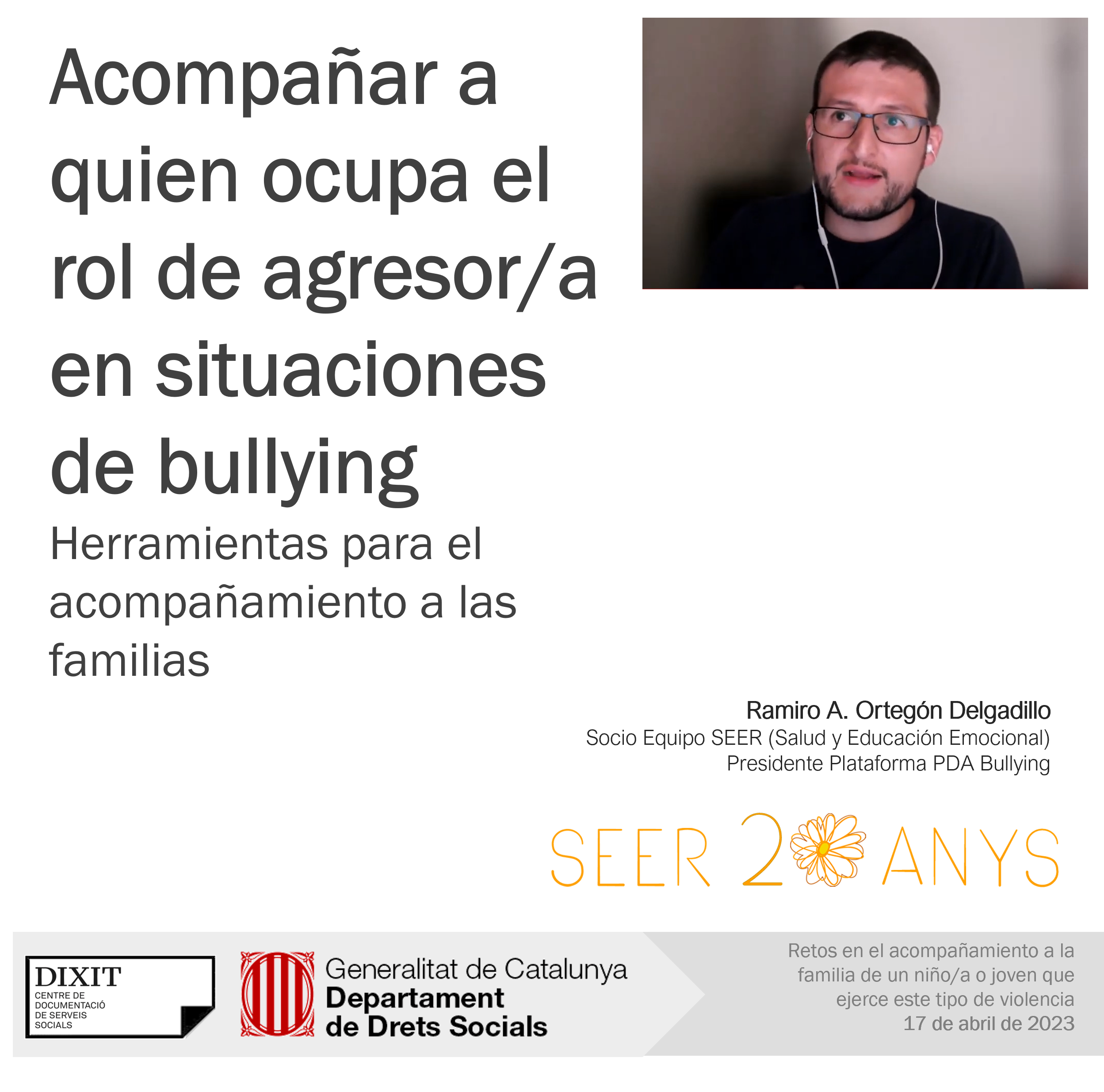 En colaboración con el DIXIT (Centro de Documentación de Servicios Sociales) se proponen dos conferencias virtuales sobre 'Acompañar a quien ocupa el rol de agresor/a en situaciones de 'bullying', de la mano de Ramiro A. Ortegón, Presidente de la Plataforma PDA Bullying y Socio de Equipo SEER.