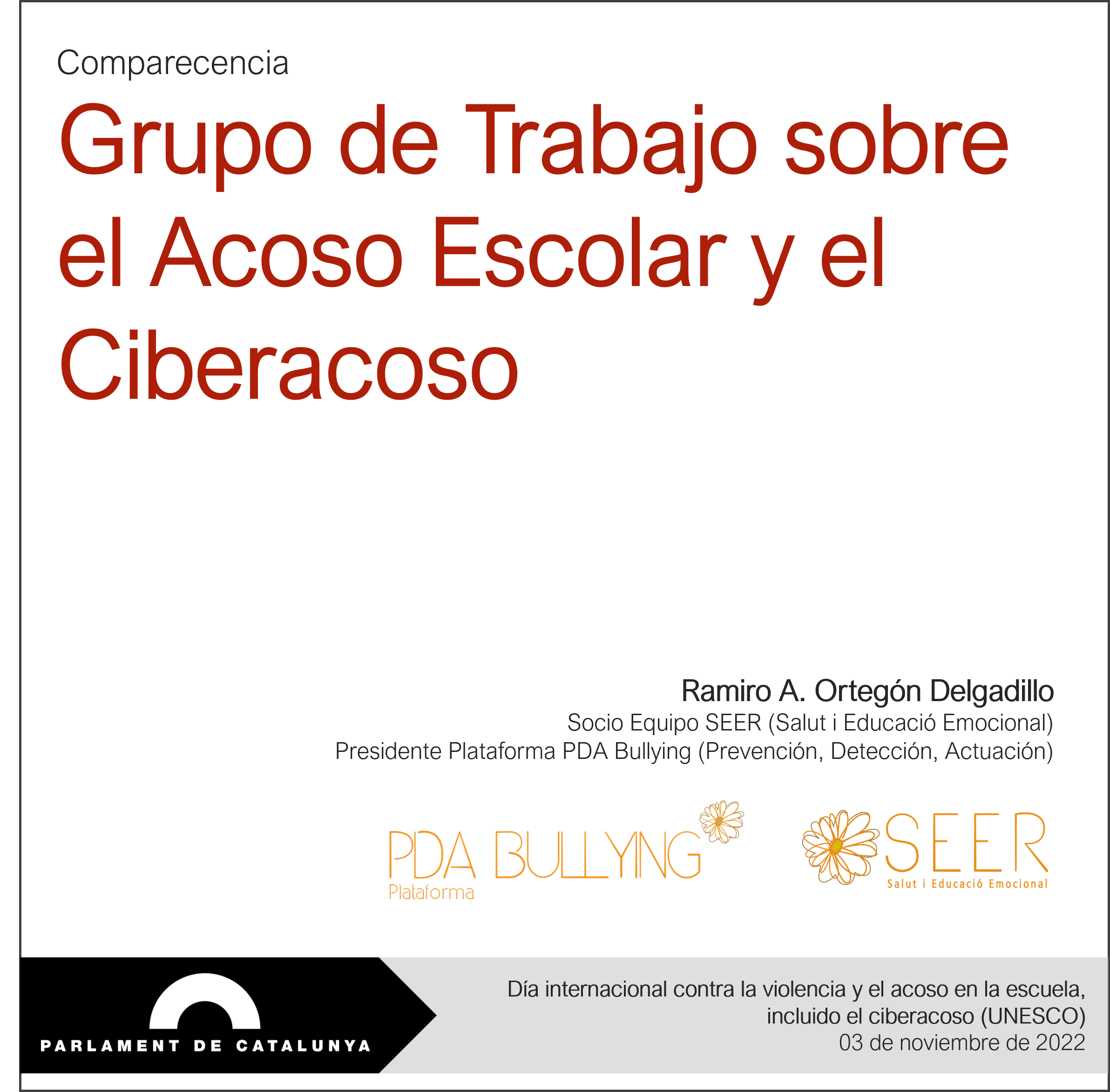 El Parlamento de Cataluña convoca el 3 de noviembre de 2022 la audiencia de una representación de la Plataforma PDA Bullying y de Salud y Educación Emocional (SEER) ante el Grupo de Trabajo sobre el Acoso Escolar y el Ciberacoso.