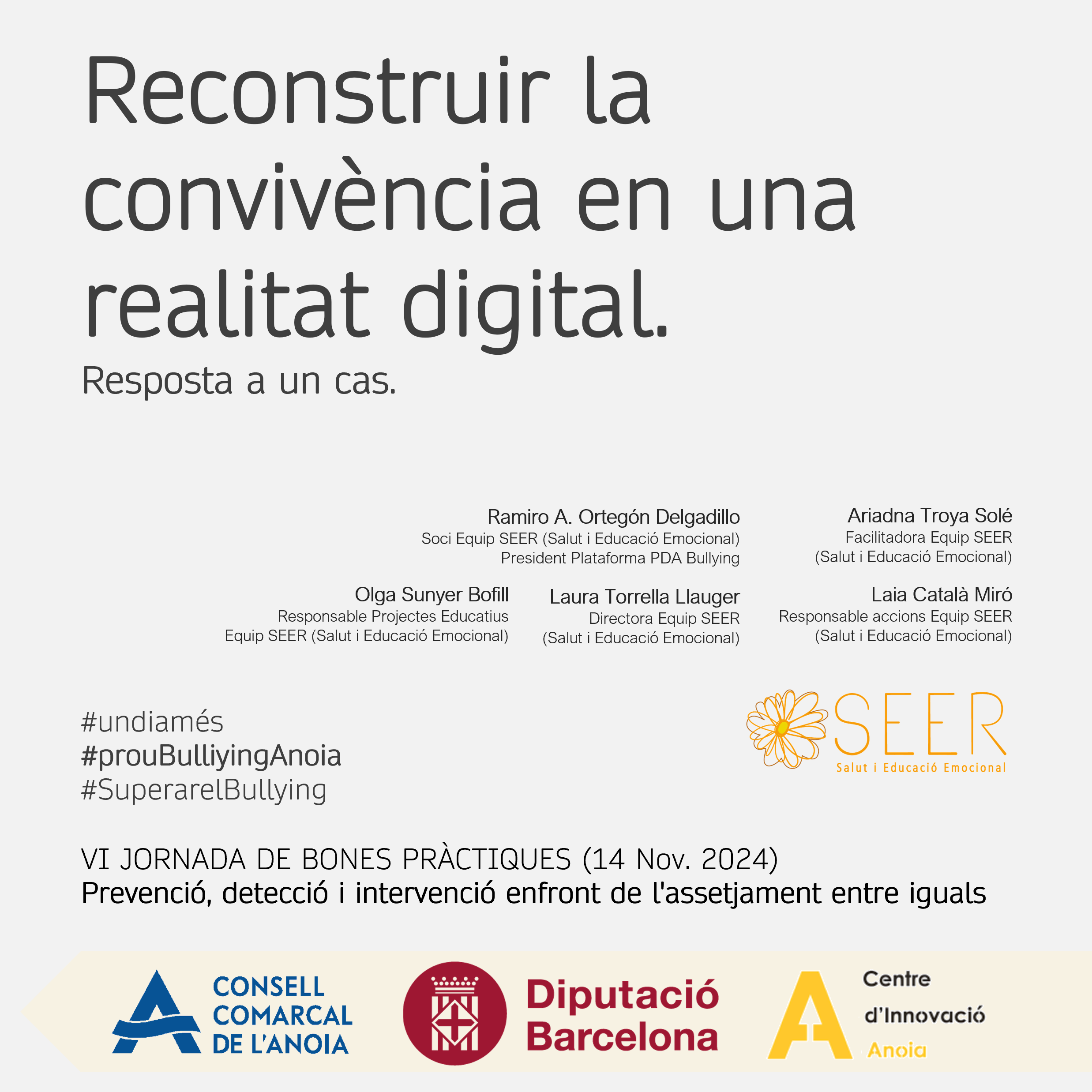 El Consejo Comarcal de la Anoia (entidad adherida a la Plataforma PDA Bullying) organiza las VI Jornadas de buenas prácticas, esta vez con un enfoque principal en "La era digital y los jóvenes: riesgos y oportunidades". Con 150 profesionales del territorio inscritas, Montserrat Jiménez presenta la conferencia inaugural y Equip SEER dinamiza los espacios de trabajo sobre la respuesta a casos.