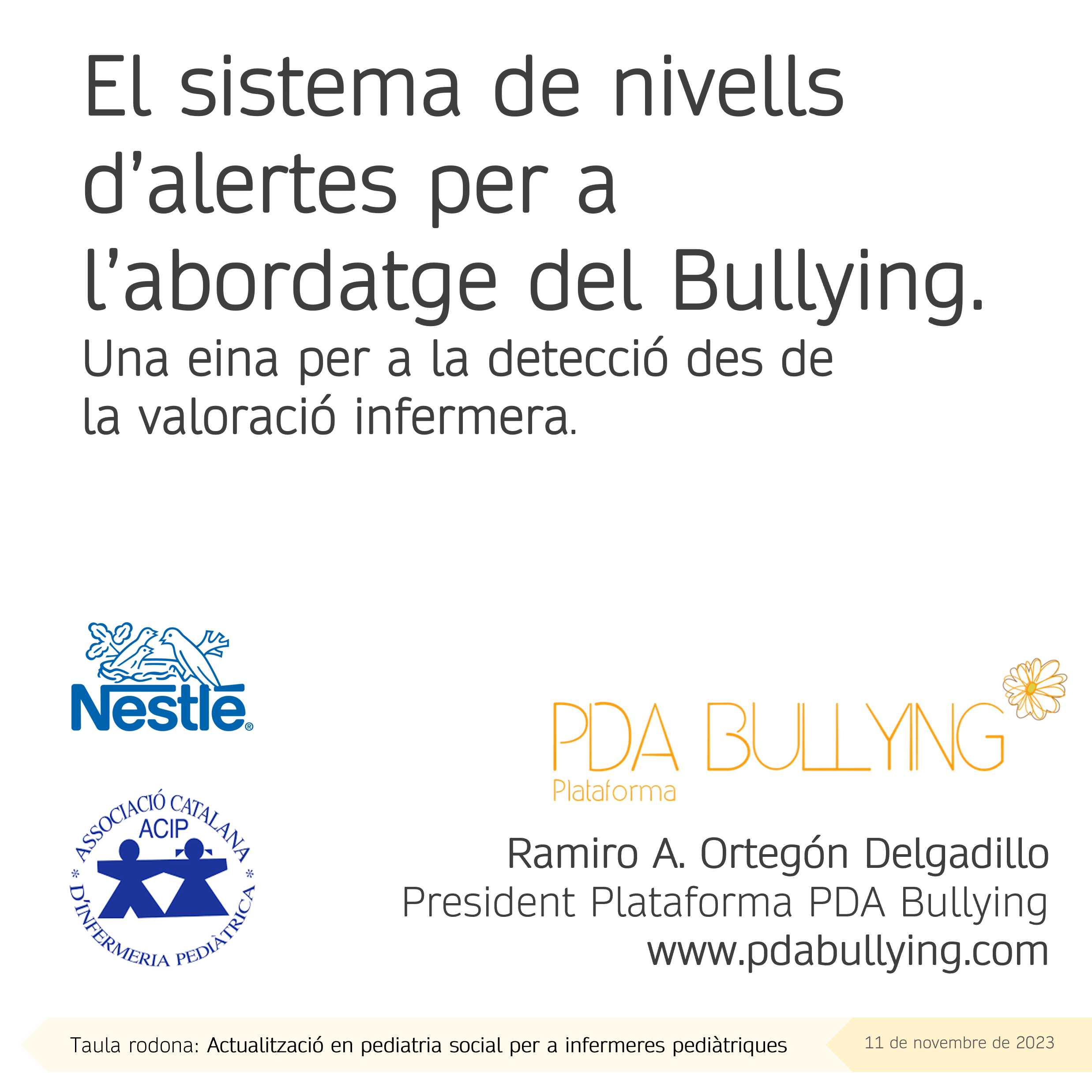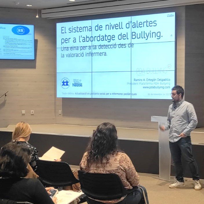 El 11 de noviembre de 2023, en el Auditorio Nestlé de Esplugues de Llobregat, de la mano de Ramiro Ortegón, Presidente de la Plataforma PDA Bullying, presentamos “El sistema de niveles de alertas para el abordaje del Bullying, una herramienta para a la detección desde la valoración enfermera”.