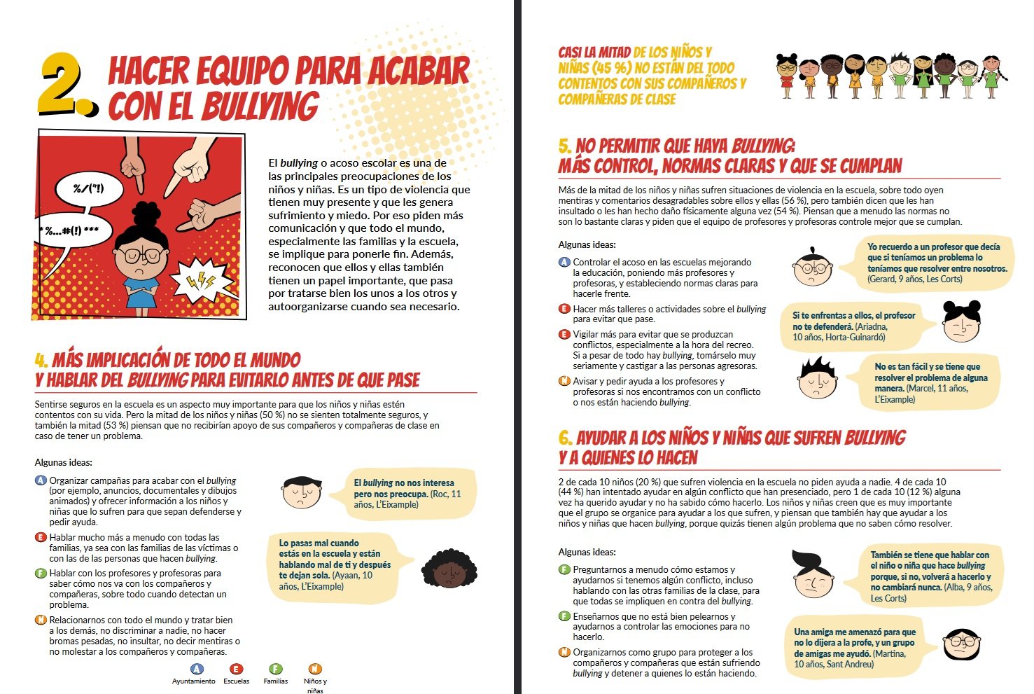La Agenda de los Niños pone de manifiesto los temas que más preocupan a los niños de Barcelona, y entre estos once temas piden ayuda para superar el bullying (demanda 2), con ideas para hacerlo como organizar campañas o talleres, implicar a los maestros y familias para que hablen entre ellos y puedan saber mejor cómo les va a los niños, o apoyarse mutuamente.