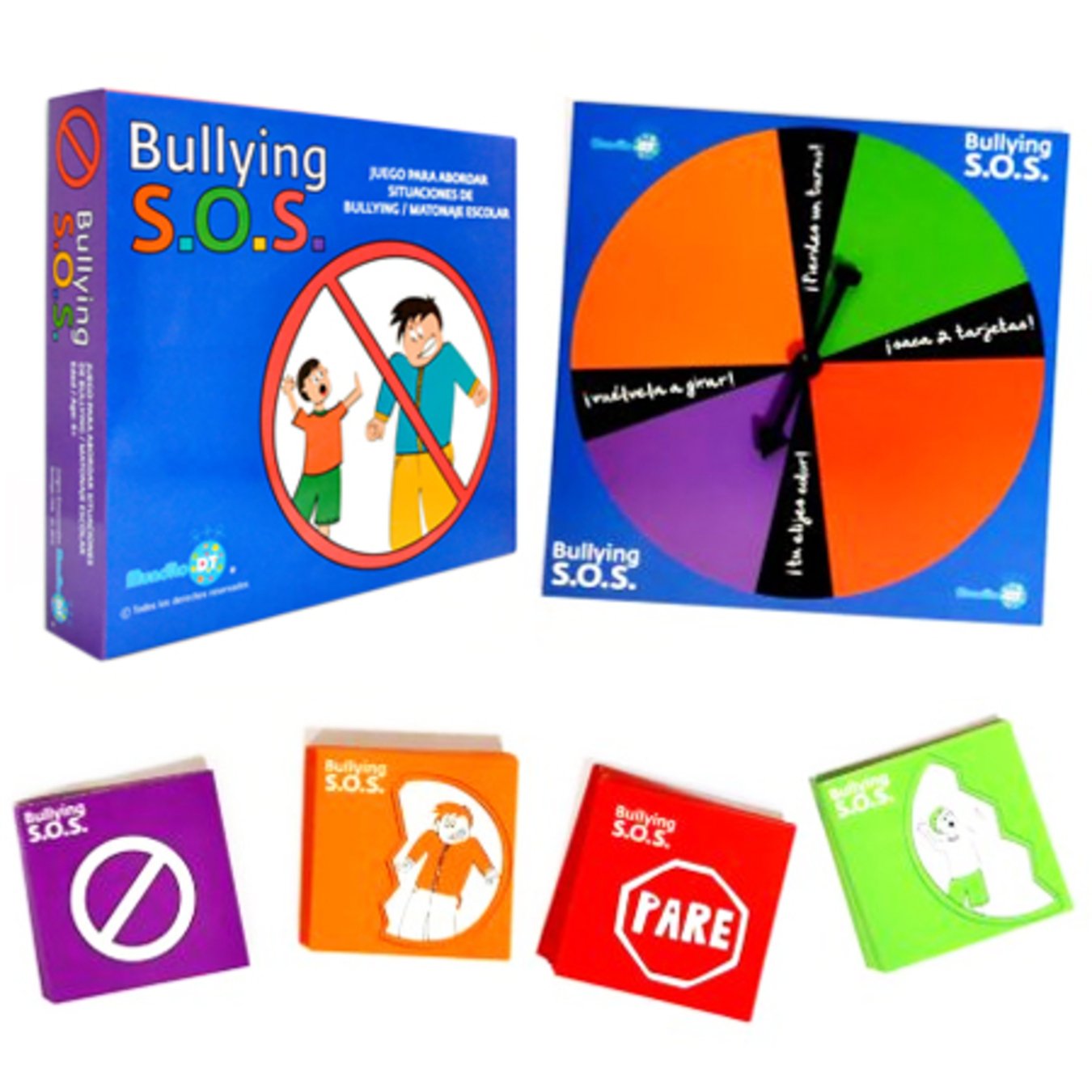 Bullying S.O.S. es un juego de ruleta que ha sido desarrollado por la editorial Mundito DT Chile para ayudar, informar y educar a los niños sobre el Bullying. Está dirigido a niños de 6+ años e incluye 1 tablero con ruleta, 120 tarjetas y un instructivo.