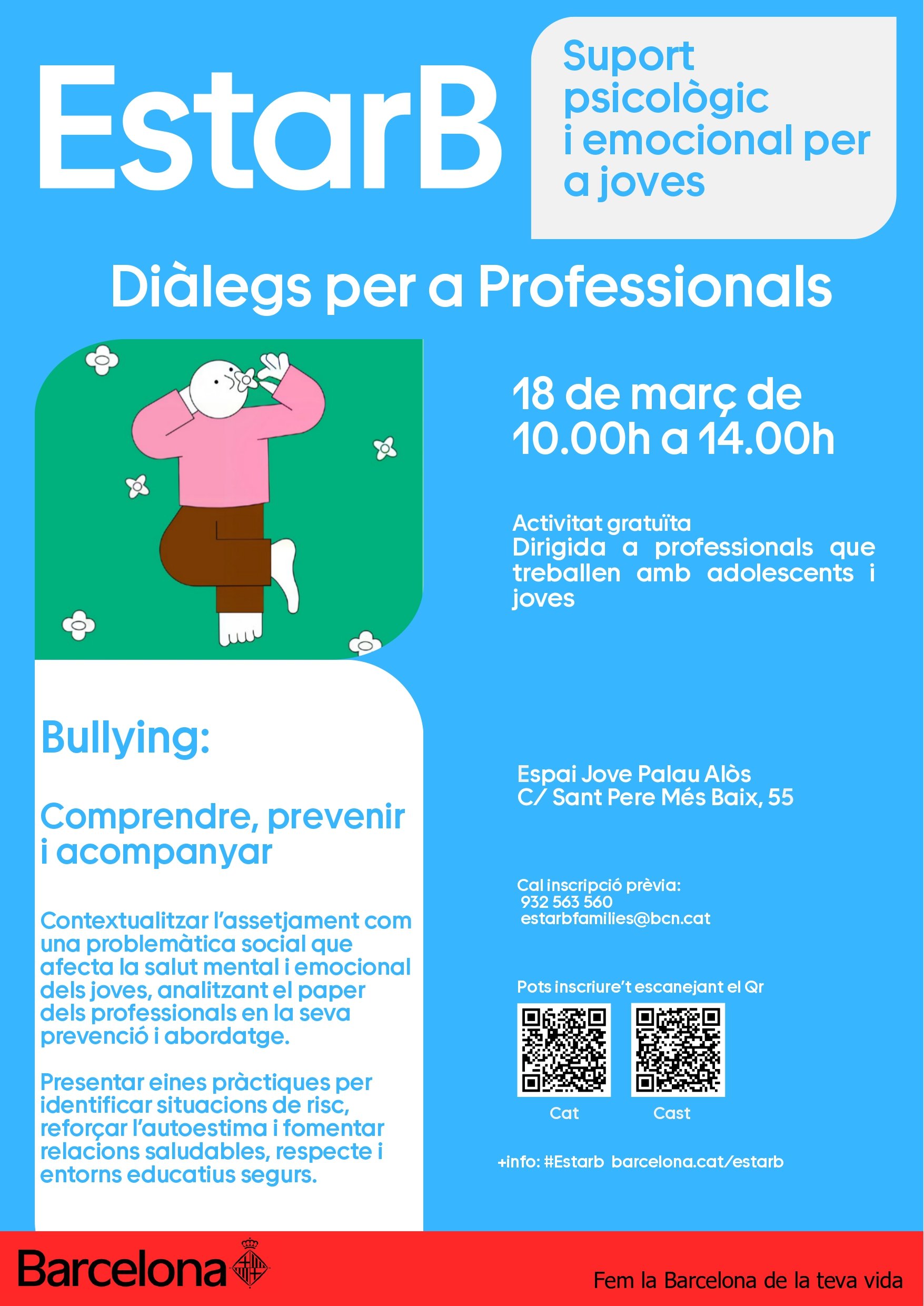 El servicio EstarB Joves (Ayuntamiento de Barcelona) organiza la XXIII edición de los Diálogos para profesionales, "Bullying. Comprender, prevenir y acompañar" el 18 de marzo de 2026 (de 10h a 14h en el Espai Jove Palau Alòs), en la C/ de Sant Pere Més Baix, 55.