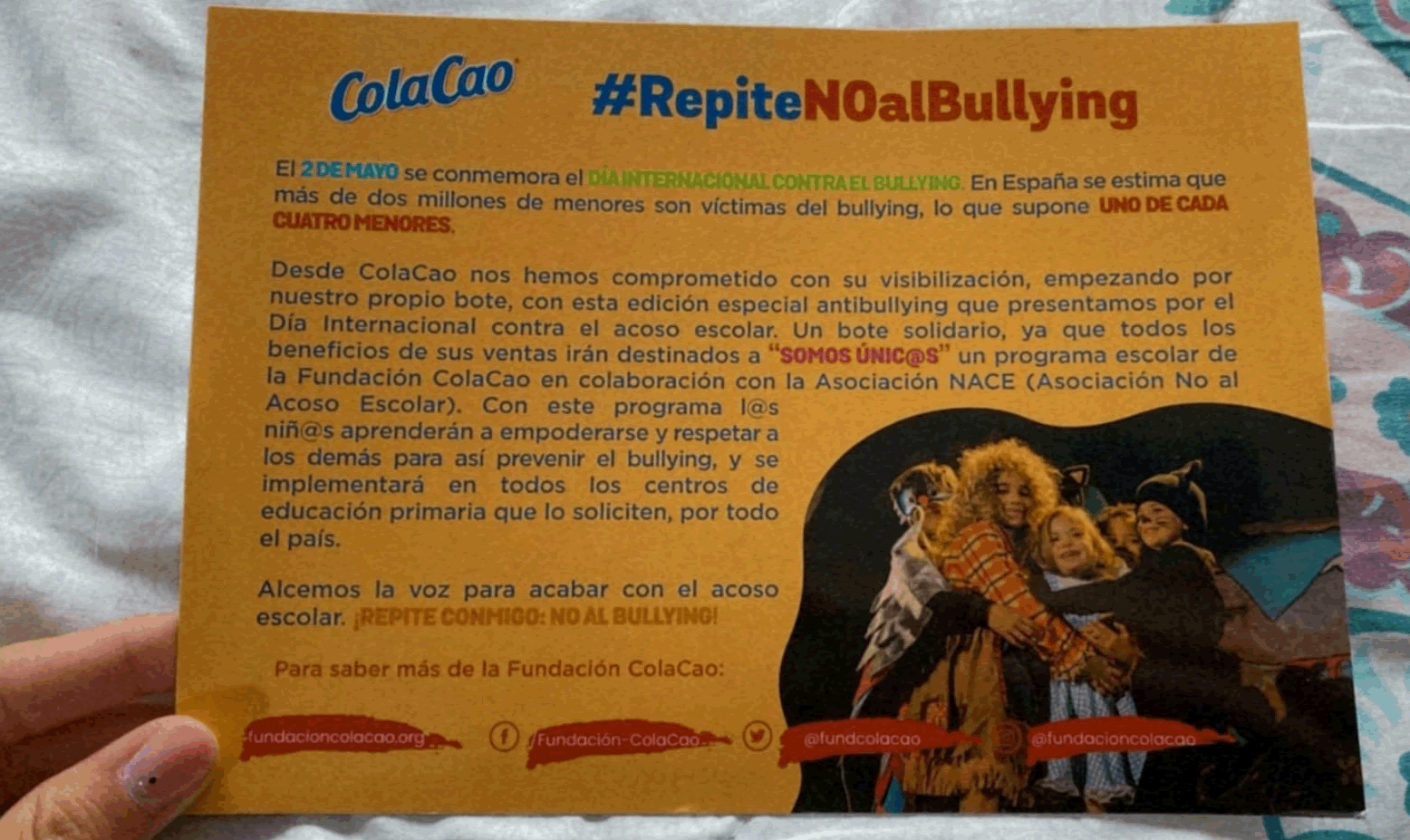 Con motivo del 2 de mayo de 2022, Día Internacional del Acoso Escolar, lanza una edición solidaria de su bote y cambia el aspecto de su icónica etiqueta. Así, el habitual diseño ha sido sustituido por uno que incluye distintos mensajes para empoderar a los niños/as a poner en valor sus singularidades. Mensajes como “Mis diferencias me hacen únic@”, “Nadie es mejor que nadie” o “Puedo hacer todo lo que me proponga”, además de un contundente “No al bullying” buscan crear conciencia a través de uno de los iconos de la marca.