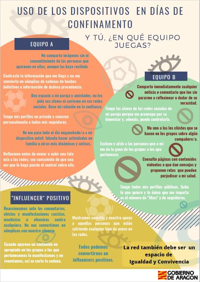 Una serie de infografías lanzadas desde el Departamento de Educación del Gobierno de Aragón. Van dirigidas a alumnos de primaria, secundaria y sus familias e intentan combatir el crecimiento del ciberacoso en tiempos de confinamiento a causa del COVID-19 en el que ha aumentado tanto el uso de internet.
