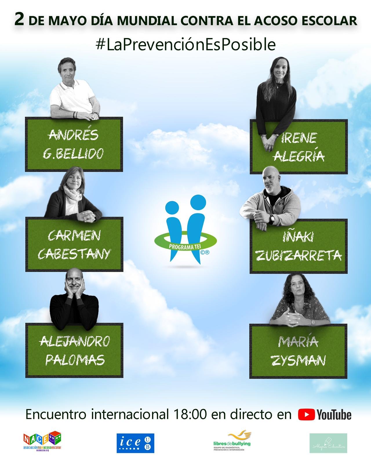 Con motivo del día mundial contra el Bullying, el 2 de mayo de 2020 a las 18:00 h, TEI (Tutoría Entre Iguales) ofrece un encuentro virtual que se puede seguir en directo por Youtube para hablar sobre la temática del acoso escolar con varios profesionales y caras conocidas.