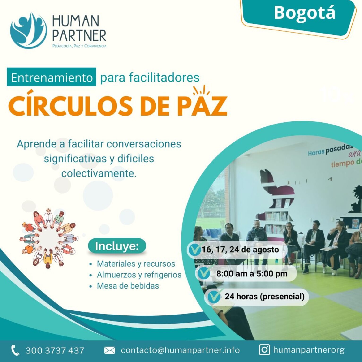 Este entrenamiento para facilitadores "círculos de paz" liderado por Human Partner pedagogía, paz y convivencia, busca brindar conocimientos teóricos y prácticos en la facilitación de Círculos de Paz mediante reflexiones, ejercicios y la transferencia de habilidades, con el propósito de acompañar y fortalecer la vida grupal, desarrollar competencias colectivas y atender situaciones de convivencia.
