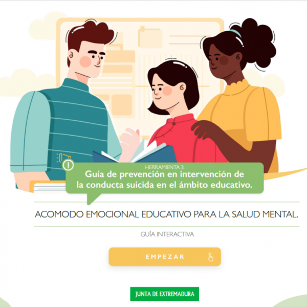 Guía interactiva de la junta de Extremadura sobre cómo prevenir ante el riesgo de presentar posibles conductas suicidas, como nueva herramienta de acomodo emocional para el abordaje de los profesionales educativos y las familias en relación con la importancia y necesidad de la promoción de la salud mental en el ámbito educativo.